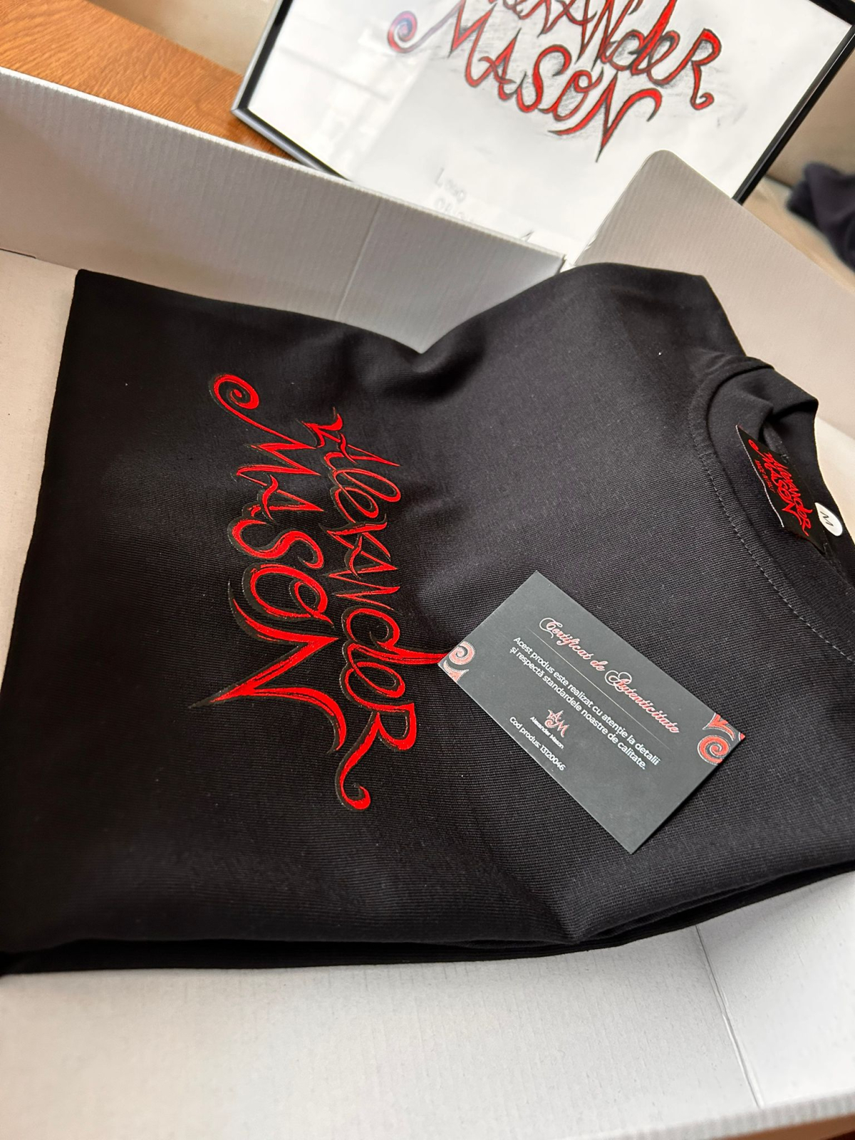Tricoul Alexander Mason este o piesă statement, creată pentru un look curat, dar cu personalitate puternică. Designul negru este pus în evidență de imprimeul frontal Alexander Mason în roșu cu contur negru, realizat într-un stil expresiv, cu influențe streetwear/luxury și accente edgy.